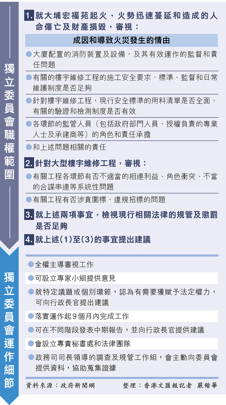 他表示,委員會在未來9個月將按照行政長官公布的職能範(fàn)圍聚焦三大範(fàn)疇,包括了解起火與火勢迅速蔓延的情況及理由,檢視大型樓宇維修工程的安排,以及檢視現(xiàn)行法律、規(guī)管與懲罰是否足夠。委員會審視之後所得的結(jié)果會向行政長官提出建議,以助力政府深化改革,防止類似事件再次發(fā)生。