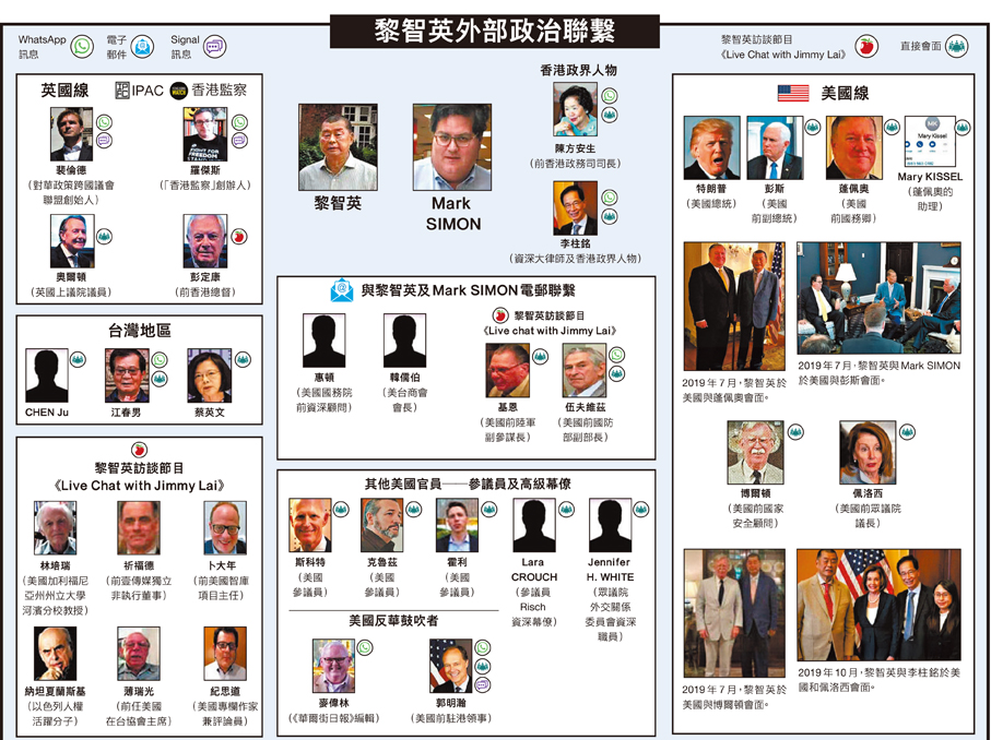 根據(jù)黎智英與助手Mark Simon之間的WhatsApp信息,知道Mark Simon致力為黎智英做事,包括嘗試安排黎與美國時任眾議院議長佩洛西、時任美國總統(tǒng)特朗普等見面。最終,2019年7月,黎智英與時任美國副總統(tǒng)彭斯、參議員會面,可見Mark Simon在黎智英與美國官員之間從中遊走,令黎智英向美國政府作出游說、尋求支持。