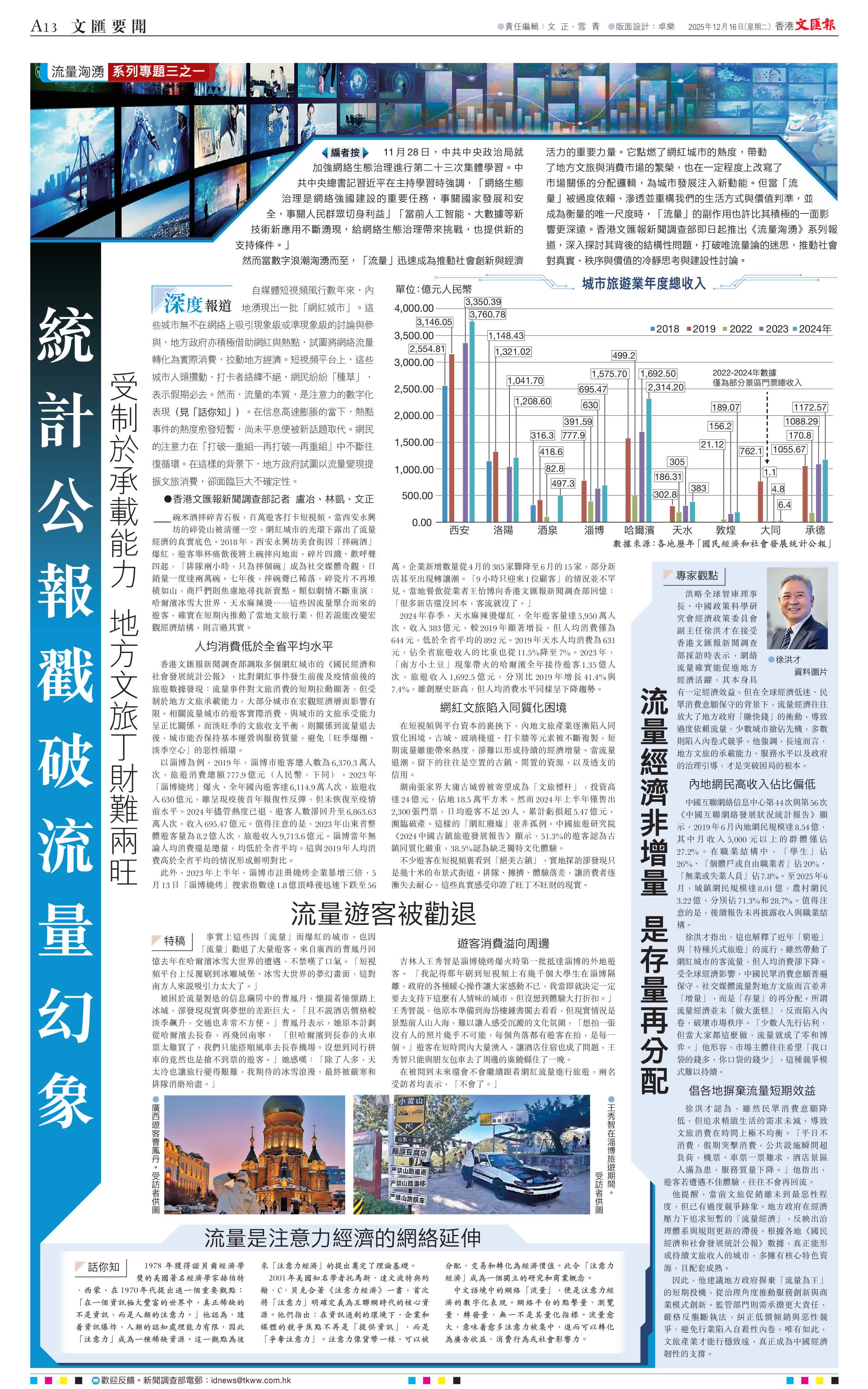 然而當(dāng)數(shù)字浪潮洶湧而至,「流量」迅速成為推動(dòng)社會(huì)創(chuàng)新與經(jīng)濟(jì)活力的重要力量。它點(diǎn)燃了網(wǎng)紅城市的熱度,帶動(dòng)了地方文旅與消費(fèi)市場(chǎng)的繁榮,也在一定程度上改寫了市場(chǎng)關(guān)係的分配邏輯,為城市發(fā)展注入新動(dòng)能。但當(dāng)「流量」被過度依賴、滲透並重構(gòu)我們的生活方式與價(jià)值判準(zhǔn),並成為衡量的唯一尺度時(shí),「流量」的副作用也許比其積極的一面影響更深遠(yuǎn)。香港文匯報(bào)新聞?wù){(diào)查部即日起推出《流量洶湧》系列報(bào)道,深入探討其背後的結(jié)構(gòu)性問題,打破唯流量論的迷思,推動(dòng)社會(huì)對(duì)真實(shí)、秩序與價(jià)值的冷靜思考與建設(shè)性討論。